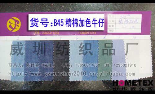 織物組織:平紋 幅寬:150cm 品名:滌棉牛仔 密度:64*47 水洗工藝:砂洗 貨號:B45精棉加色 重量:* 具體用途:休閑服、工作服、褲裝、時裝 別名:B45精棉加色 印染工藝:印花 成分及含量:65%棉,35%滌 主要用途:服裝用布 ======================================================================= 以上產品全部現貨供應,可隨時提供樣布卡和現貨,隨時發貨。所有產品全部是廠家直銷價,我們承諾:以超低利潤營銷,我 們只求銷售量。為保證您的利益,我司建議您在采購前先確認我們的品質樣與顏色樣后再拿大貨,期待與您的真誠合作。因產 品種類較多,具體參考未盡詳盡,如有需要,請您與我們聯系。 瑞豐紡織(中大旗艦店)坐落于國內最大的紡織面料產業中心—廣州中大,是一家專業銷售面料的廠家直銷商。主要經 營產品有:全棉凈色、仿記憶絲面料、全棉(TC)色織等,面料品種花達上千余種,所有產品全部現貨經營。 我們面料的品質來源于:1、采用國內外優質的原材料;2、使用精良的生產工藝和設備;3、完善的生產質量管理體系。我 們具有開發和創新品種的強烈意識和優越條件,并根據客戶需求與市場變化時時推出潮流面料。憑著多年的專業行業經驗,根 據客戶需求,不論客戶在全國任何地方,只要提供小樣,就可在一兩天時間內輕松獲得所需面料的信息。 批發說明供應商支持混批 。 ============================================================= 有意請加QQ:1295021910或電話聯系。 公司名稱:威圳紡織品廠 聯系人:陳修喜先生 手機:13650817858 網址:http://www.gzweizhen2010.cn.alibaba.com =============================================================