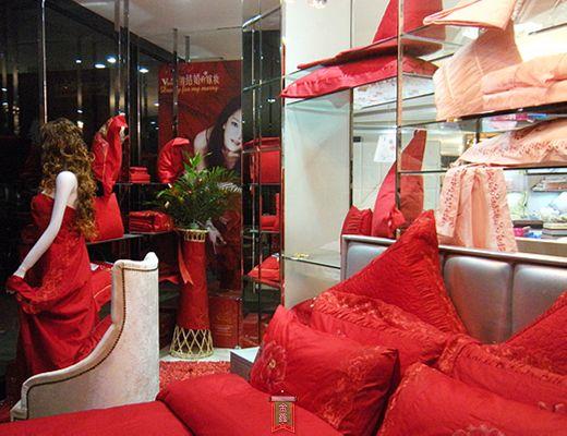走進紫羅蘭家紡汨羅專賣店,一股典雅高貴的簡約之風迎面撲來。進門左手邊,正對視覺的是一套喜結良緣床蓋六件套,它運用了中國傳統(tǒng)的服裝元素,大紅的唐裝布,華貴的金色飾邊,嬌艷飽滿,立體感強;枕面和被面上極富中國韻味的牡丹圖案,給人營造出強烈的視覺感。